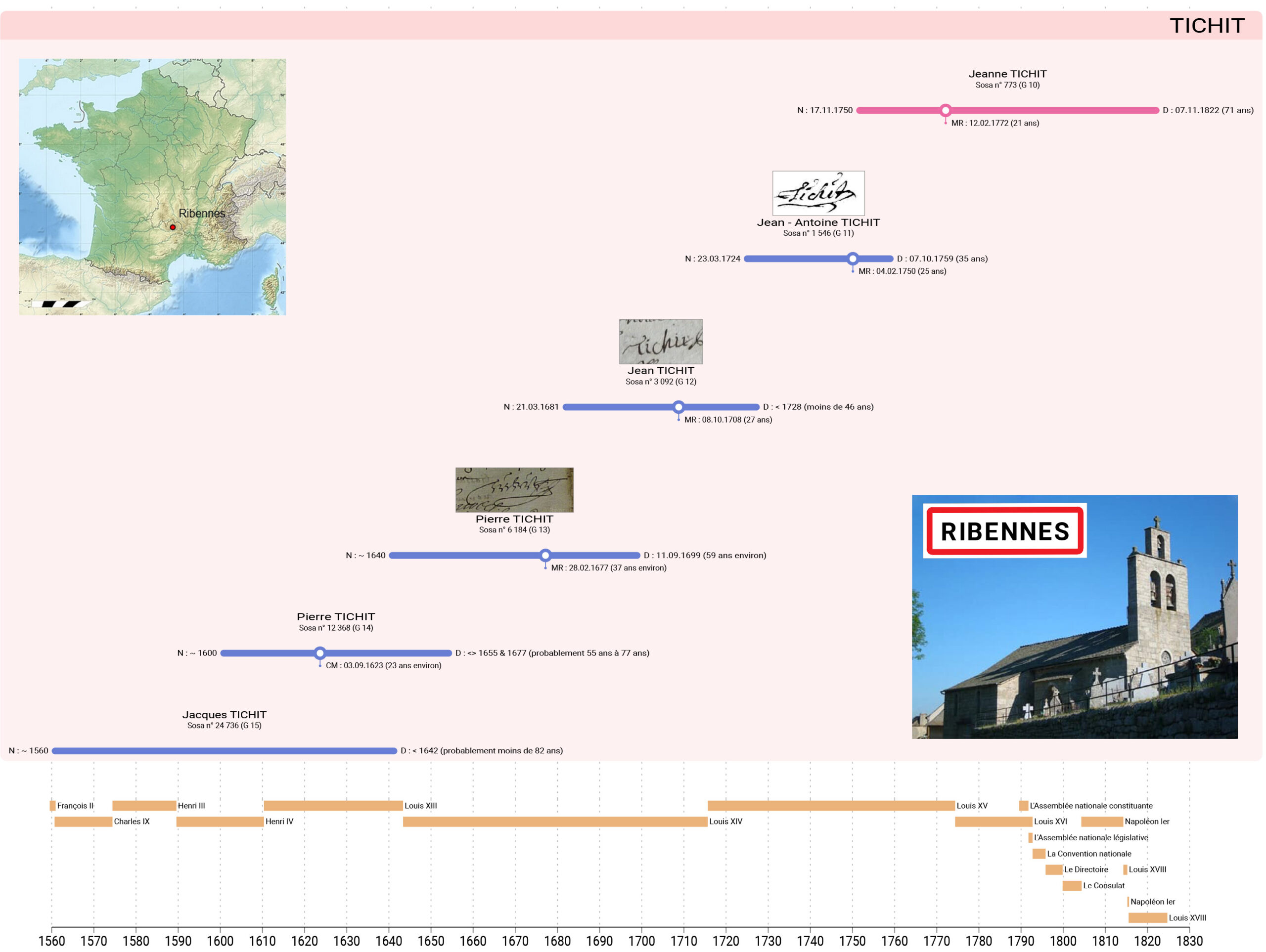 La famille Tichit est présente à Sainte-Colombe-de-Peyre, en Lozère, où elle est venue s’installer par mariage en 1623. Mais avant cela elle était établie non loin à Ribennes.