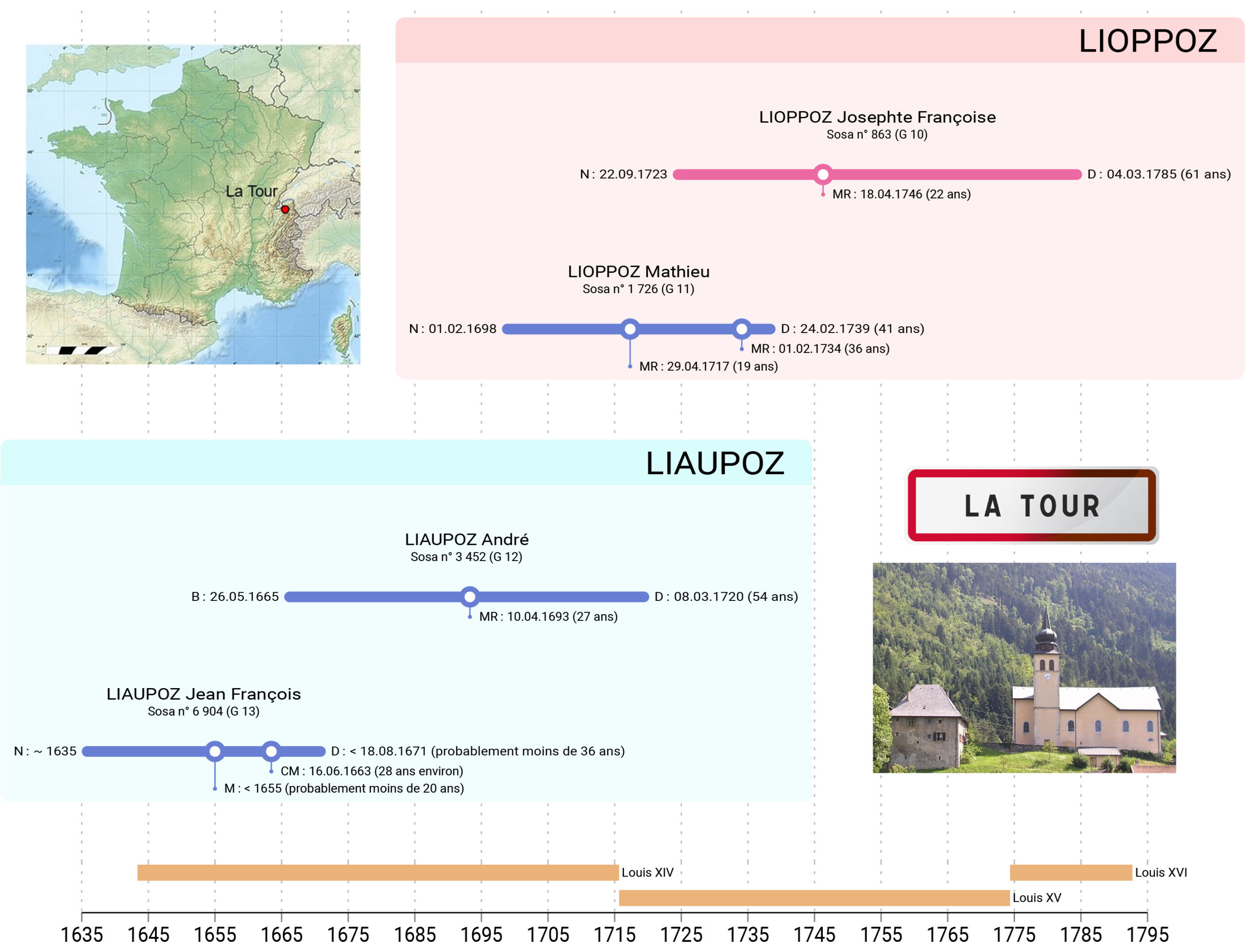 Mes Lioppoz viennent de La Tour en Faucigny au XVIIe siècle. Mais lors de la gabelle du sel de 1561 ils n’y sont pas encore. D’ailleurs, il n’y a qu’une famille installée à La Tour au XVIIe siècle ce qui tend à montrer son arrivée récente dans le village. Je pense que Jean François Lioppoz y est arrivé vers 1655 en se mariant à Clauda Ruin fille du village.
