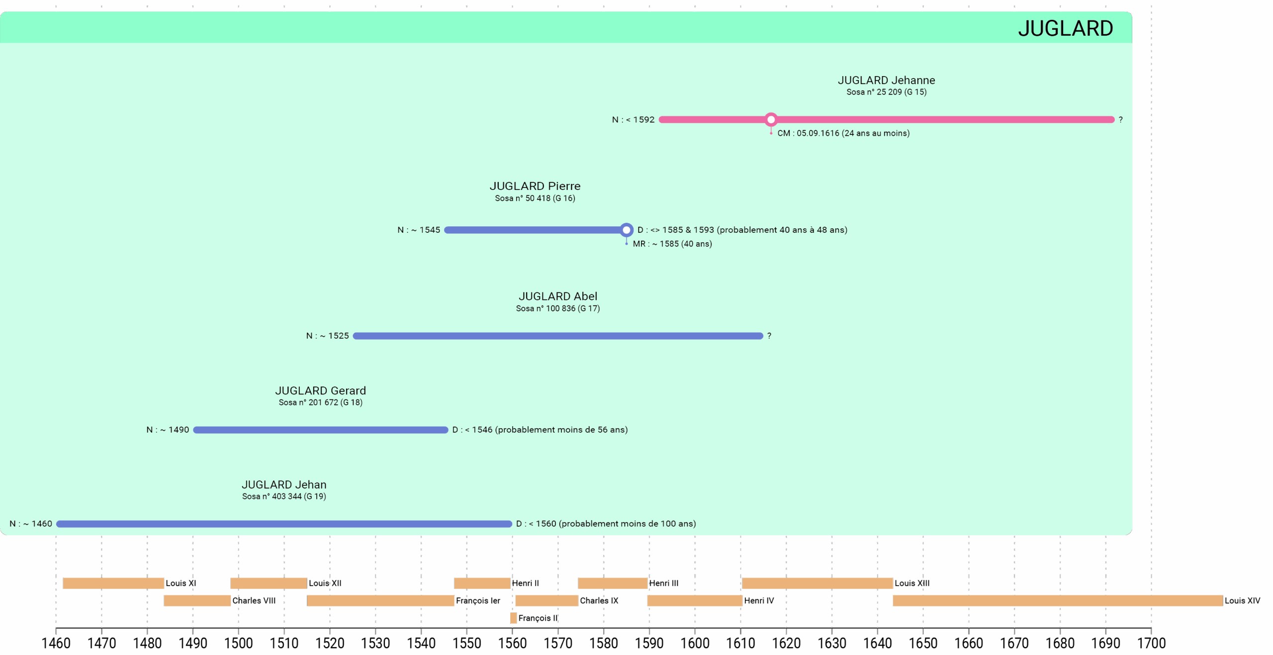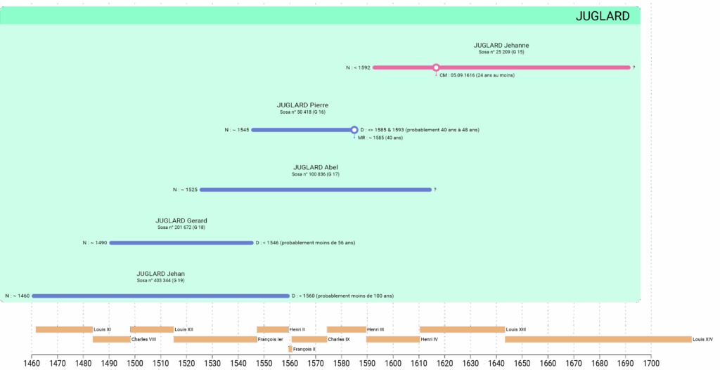 Ma branche Juglard se situe à Alençon et démarre avec Jehanne Juglard née à la fin du XVIe siècle et mère de 5 enfants entre 1616 et 1629.