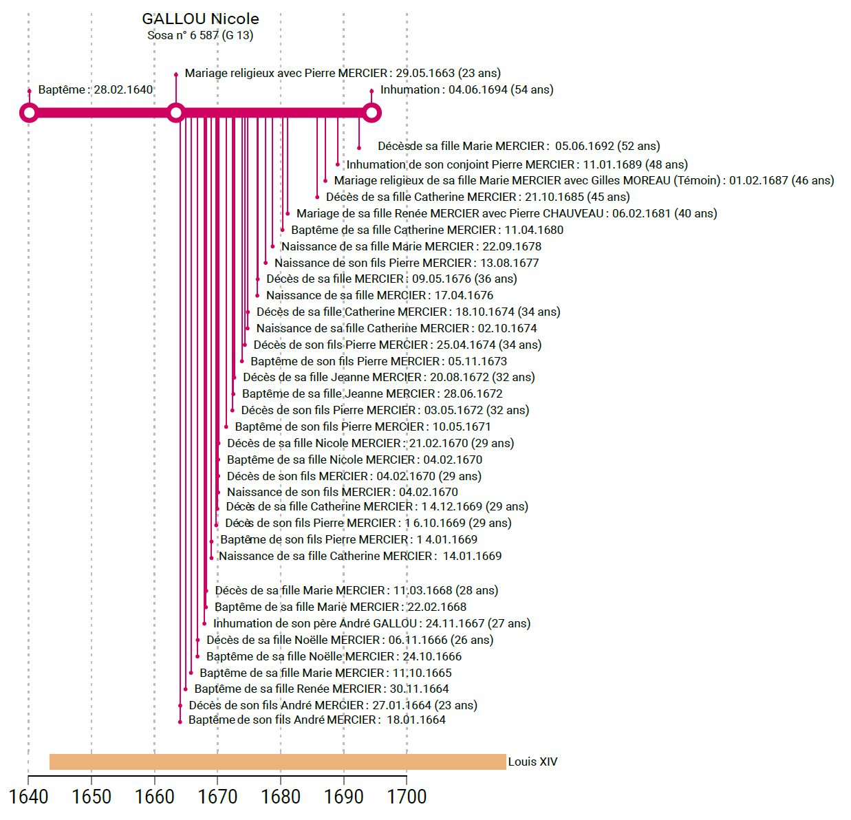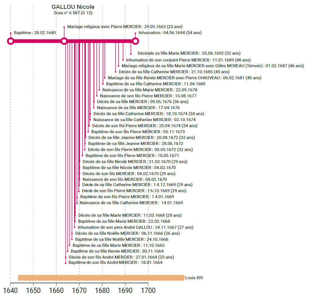 La petite-fille Nicolle Gallou a fait preuve d’une particulière fécondité puisqu’elle a eu pas moins de 17 enfants en 13 ans ! Elle les enchaine quasiment tous les ans, en a parfois 2 la même années, a deux paires de jumeaux… Mais ils meurent tous en bas âge à l’exception de deux filles et un garçon.