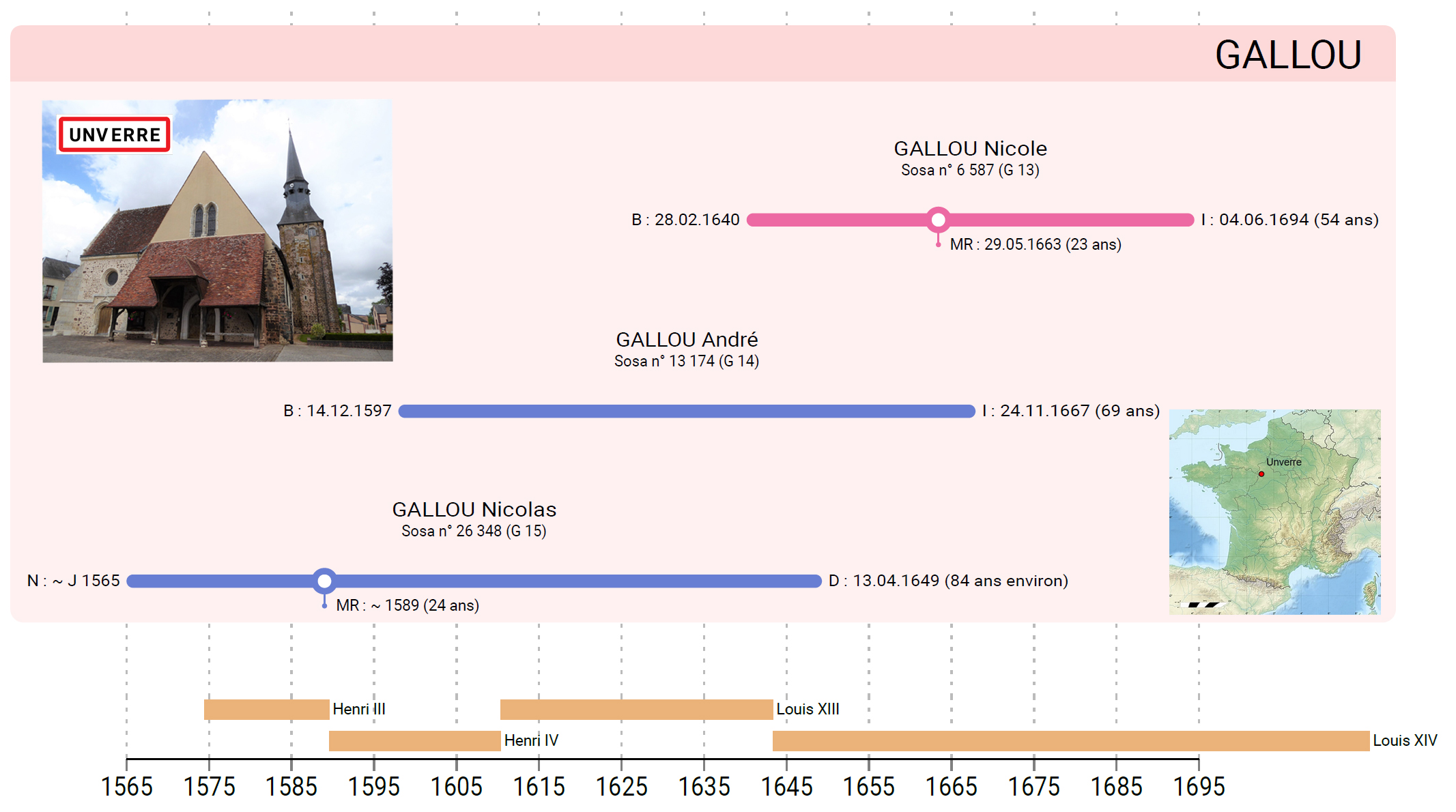 Mes Gallou sont de l’ouest de l’Eure-et-Loir, en direction de la Bretagne pourrait-on dire ! Mais ils sont implantés là depuis bien longtemps. La famille est installée à Unverre dès le XVIe siècle. On les retrouve aussi à Frazé.