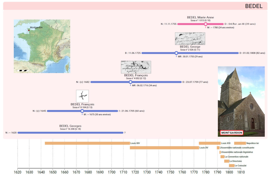 Je n’ai qu’une famille Bedel dans mon ascendance. Elle se situe dans le Cotentin dans le village de Montgardon. Je la suis sur 5 générations depuis Marie Anne Bedel que j’ai présentée avec son mari Pierre Michel Buhot dans cet article ici