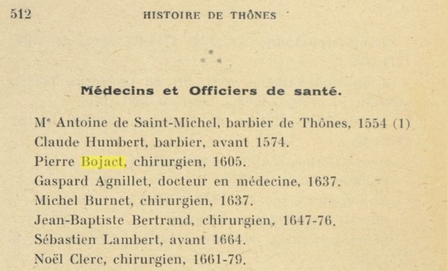 Étrangement ou non, un certain Michel Burnet y est à son tour chirurgien en 1637 alors que la femme de Pierre Bojact est justement une Burnet. Peut-être sont-ils apparentés ? Pierre Bojact se serait marié dans une famille de chirurgien de la région de Thônes ? Ou est-ce simplement un hasard et c’est une Burnet de Chessenaz ou de ses environs ? Mystère.