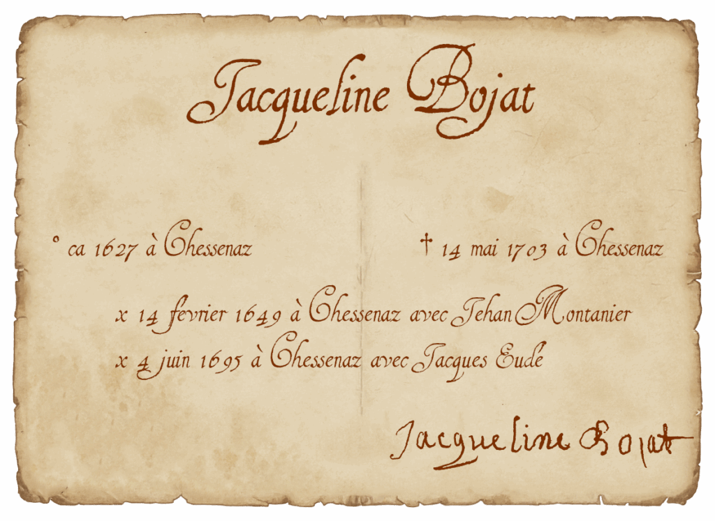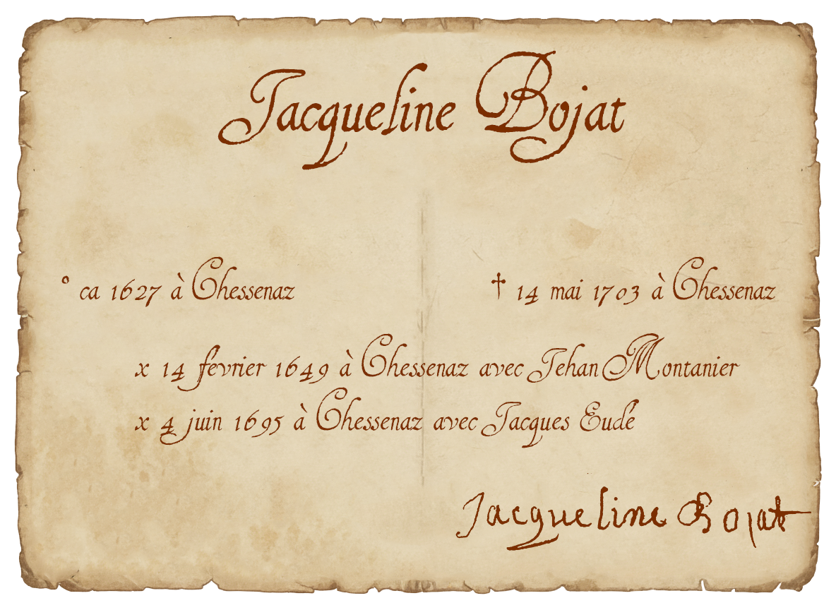 À cause des manques dans le registre de Chessenaz entre 1619 et 1629 et de 1632 à 1660 je ne peux retrouver ni la naissance de Jacqueline Bojat ni le décès de son père Pierre Bojact. À ce jour, je ne connais donc pas sa mère.