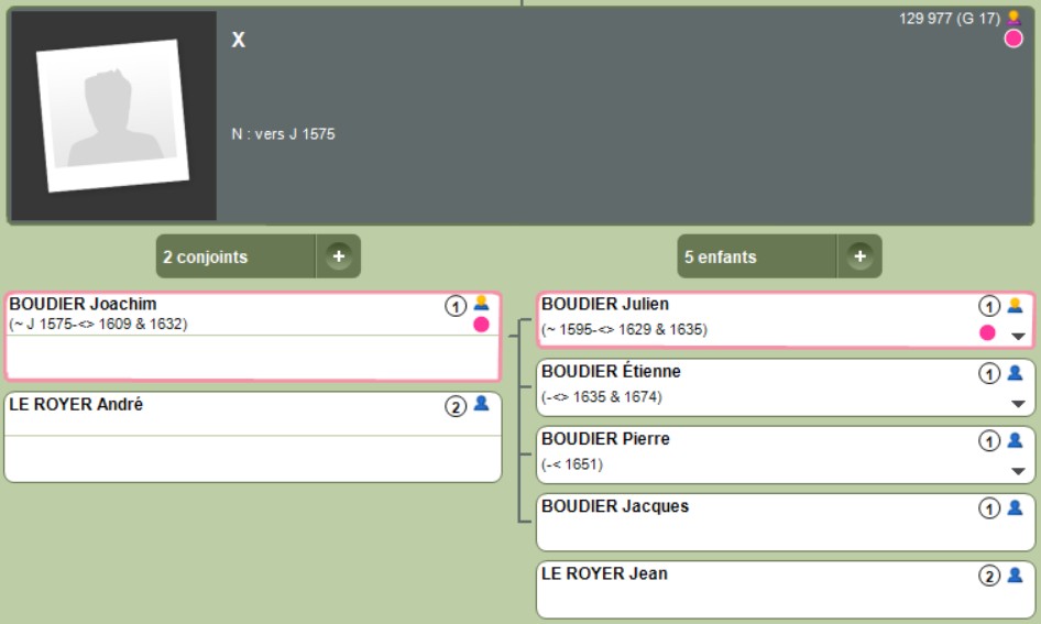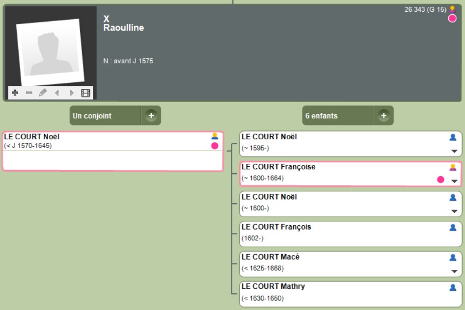 - mais j’ai aussi créé dans mon ascendance des femmes X sans prénom quand j’ai des enfants issus de deux unions différentes qui sont donc frères et sœurs utérins mais pour lesquels je n’ai aucune information sur leur mère ;