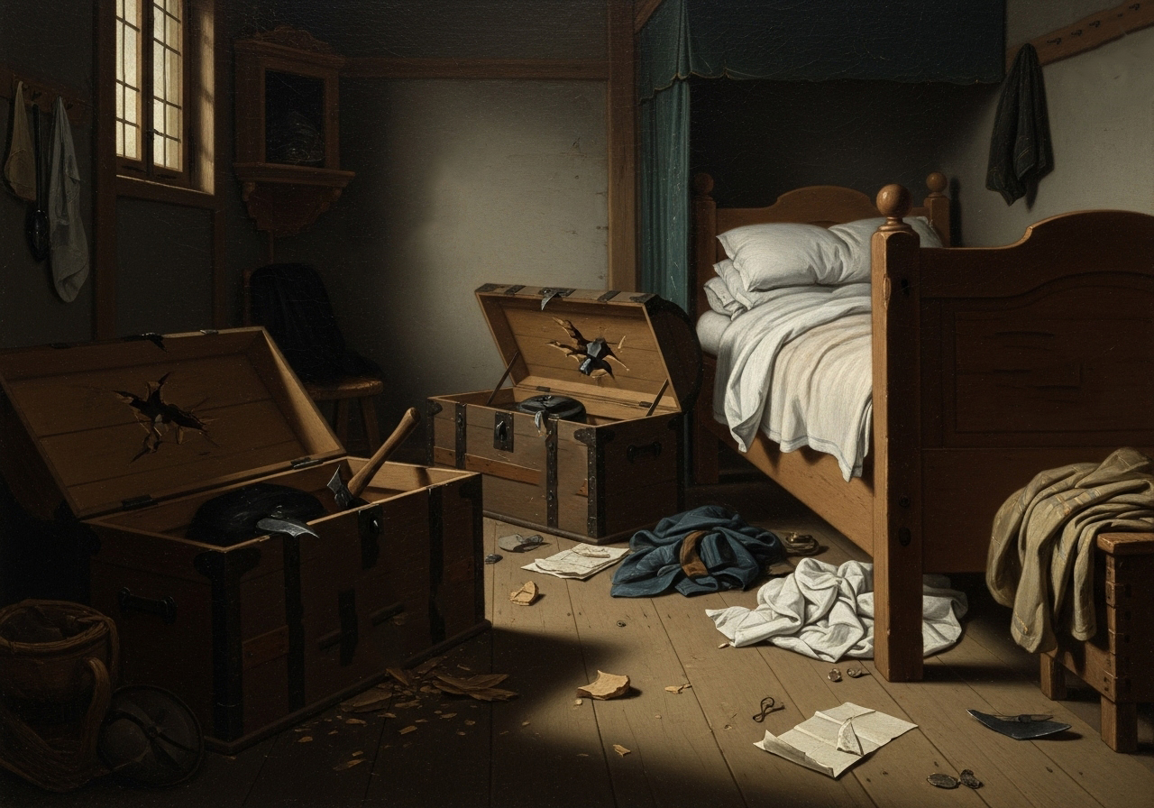 Ses fils seraient entrés armes au point, l’auraient traitée de « putain, bougresse, maquerelle, vérolée et carogne ». Ensuite de quoi ils se seraient attaqué à deux coffres à l’aide d’une hache tout en la réduisant au silence en la jetant au sol, en lui donnant des coups de pieds dans l’estomac et en lui couvrant la bouche d’une main ! Ils se seraient acharnés sur un justaucorps et une veste de son mari accrochés à proximité. Puis ils auraient emporté sur leurs chevaux quantité de linges, ses meilleurs papiers et ceux restant de son défunt mari, père de ses fils, et 200 louis d’or ainsi qu’une bague enchâssée d’un diamant valant 7 à 8 pistoles. Ils l’auraient également menacée de la brûler dans sa maison !