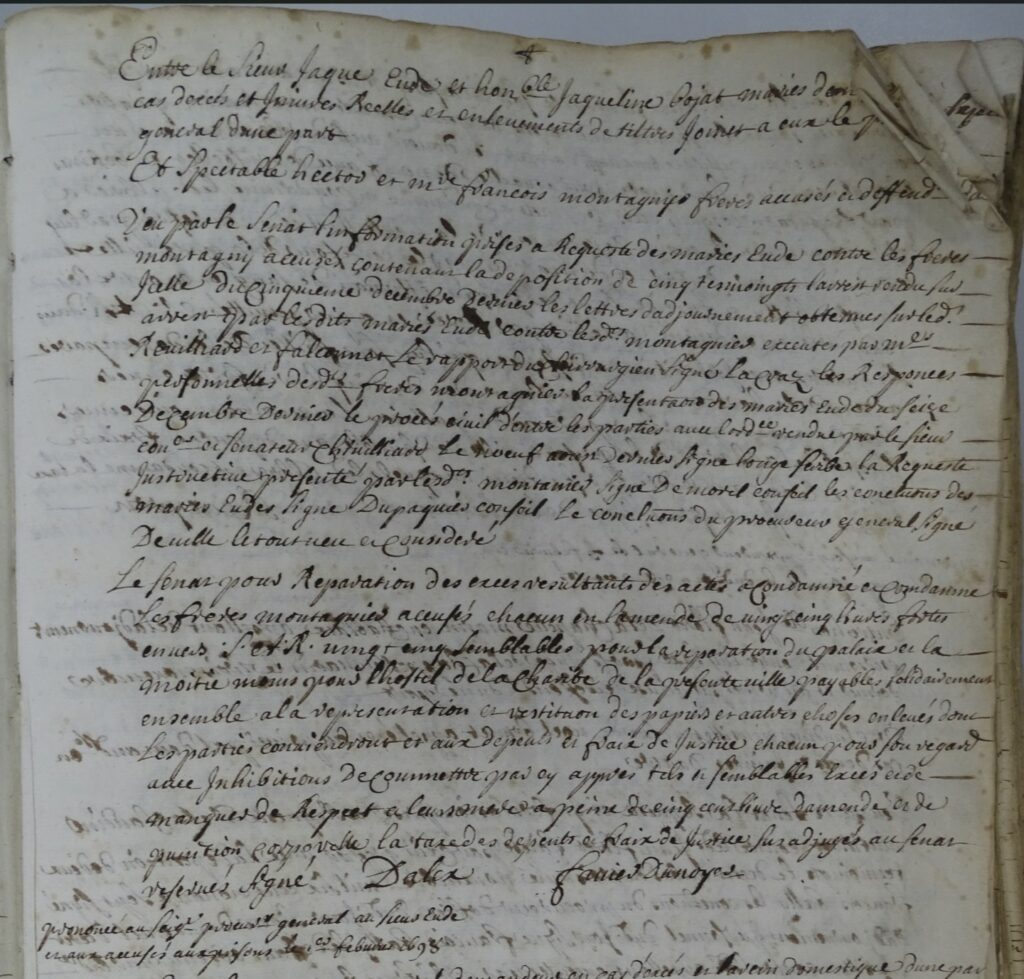 Le 1er février 1698, les frères Hector et François Montanier sont condamnés à 25 livres envers S.A.R., 25 livres pour la réparation du palais, 12 livres 10 sols pour l’Hôtel de la Charité, à la représentation et restitution des papiers et autres choses enlevés, aux dépens et frais, et frais de justice avec inhibition de commettre à nouveau de tels excès et de manquer de respect à leur mère sous peine de 500 livres d’amende et de punition corporelle.