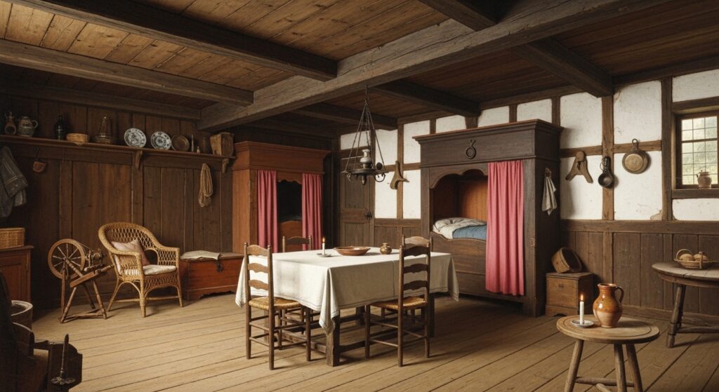 - 3 châlits de noyer, l’un avec son ciel de sapin, garnis chacun de leur garde paille coitre (couette rembourrée) et couverte sauf l’un sans couverte, les couvertes de drap de Valais, 2 ayant leur alentour de toile et l’1 de futaine