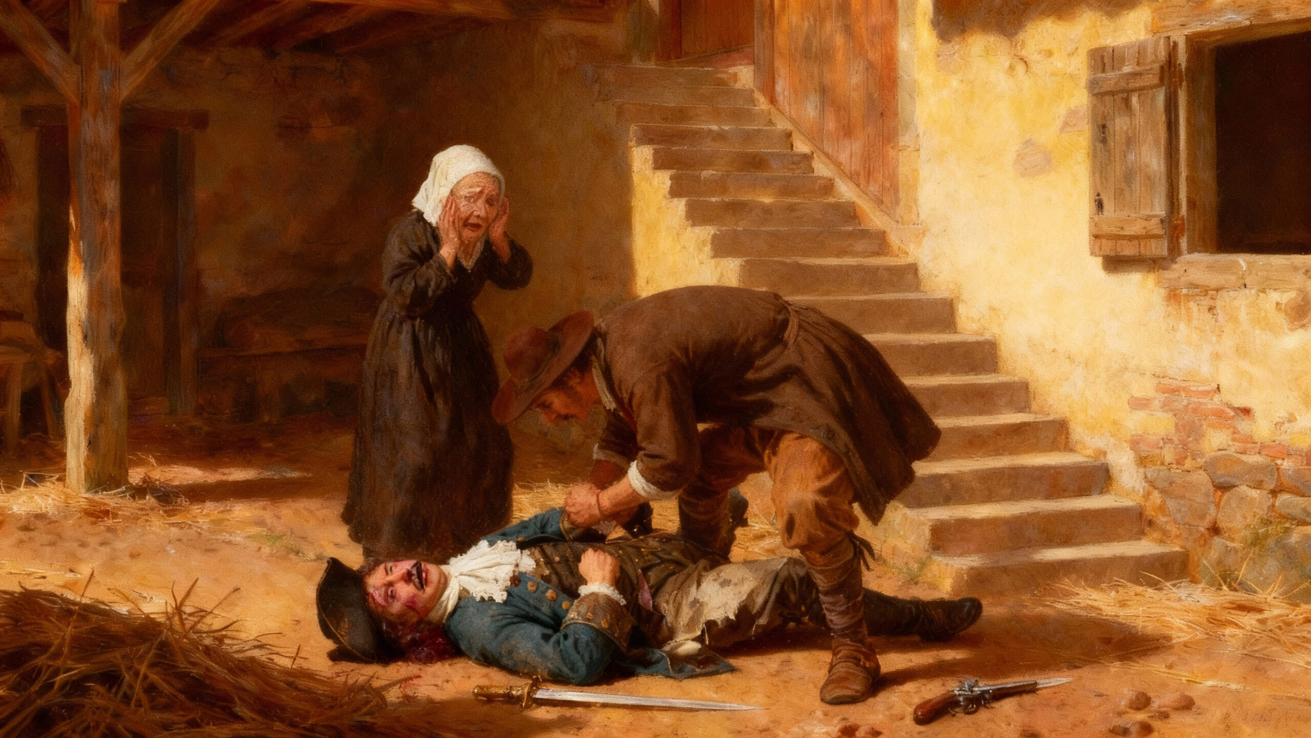 Sa femme resta figée, la main ensanglantée. Sa servante la rejoignit. François, lui, respirait encore. Alors les deux femmes le montèrent comme elles purent pour le coucher et firent appeler le chirurgien.