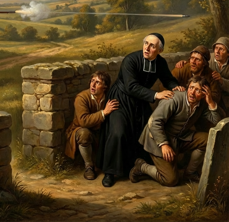 C’est alors que Hector Montanier s’énerve et après avoir copieusement insulter le curé de « bougre, fripon, voleur, assassin et adultère » il lui dit même « foutu adultère putanier je te les donnerai les clefs de l’église » et le met en joue avec son fusil chargé de menus plombs. Heureusement le curé et ses paroissiens ont le temps de se cacher derrière la muraille du cimetière. C’est l’église qui est touchée et un paroissien légèrement effleuré à l’oreille.