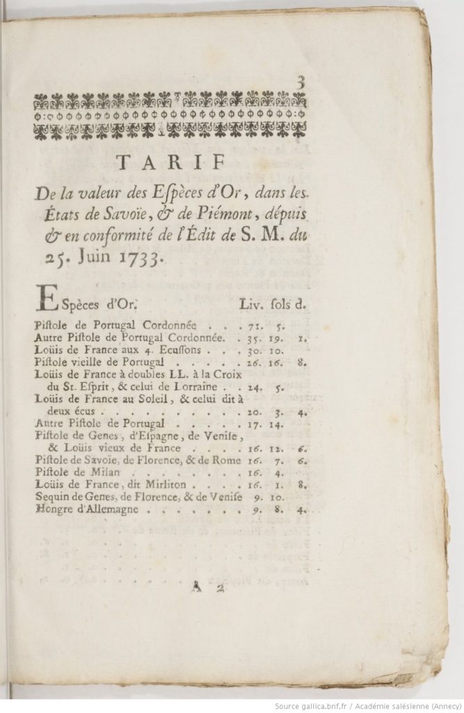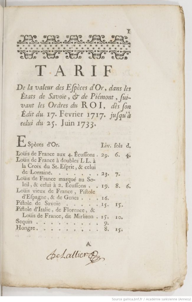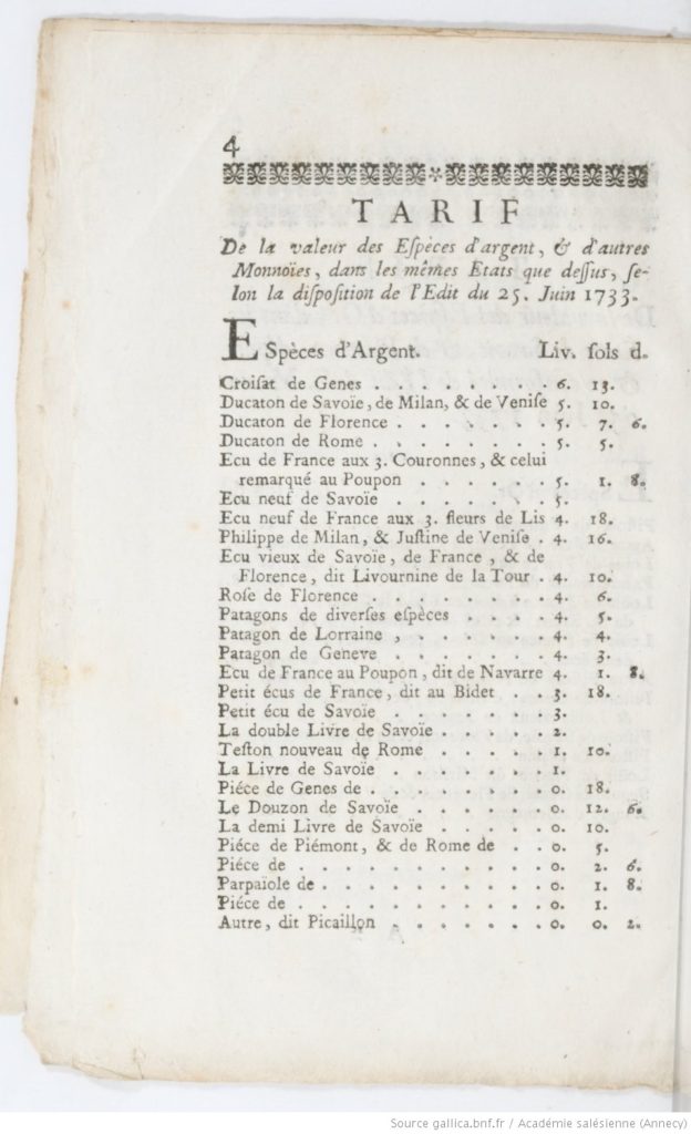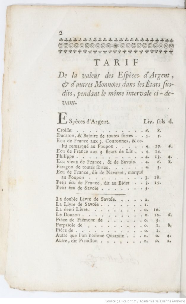 Le rapport généralement admis de l’ancienne livre de Savoie ou de Piémont à l’ancien franc ou livre tournois, était celui de 6 à 5 ; c’est-à-dire que 5 livres de Piémont valaient 6 francs.